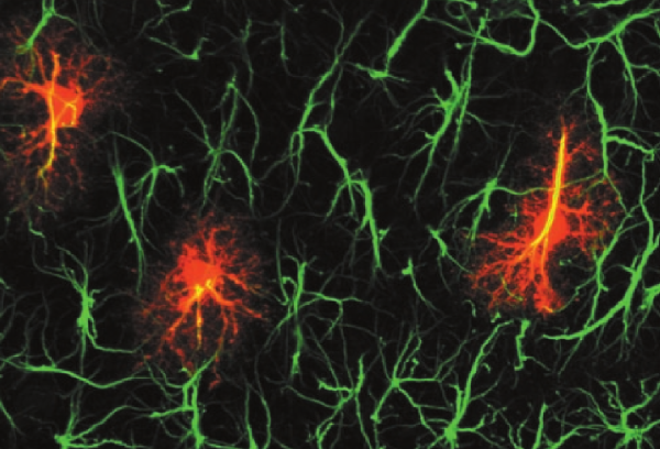 Figure 1: GFAP immunolabeling of LY-filled astrocytes (red) in CA1 stratum radiatum. Dye-filled astrocytes (red) show much more complex processes than what can be seen from GFAP immunolabeling (green). Taken from Bushong et al. (2002).